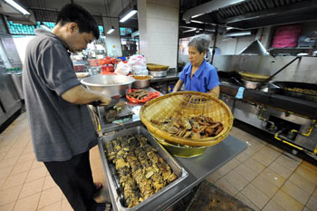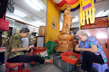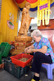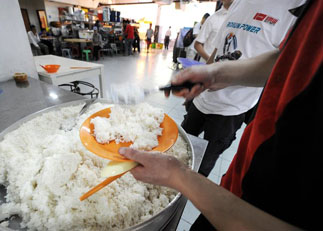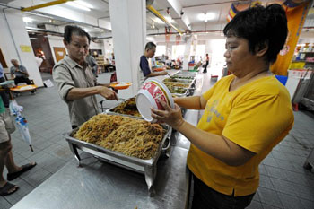 在新加坡佛教居士林里,一位来吃免费斋饭的人正在盛饭
