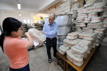 李木源居士和工作人员一起检查仓库储备
