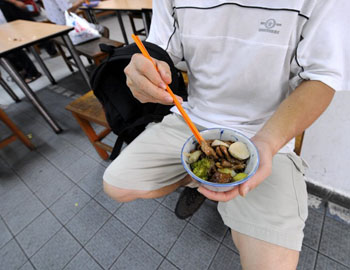 一位男子在新加坡佛教居士林的角落吃免费午餐