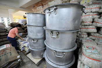寺庙负责人和工作人员一起检查仓库储备